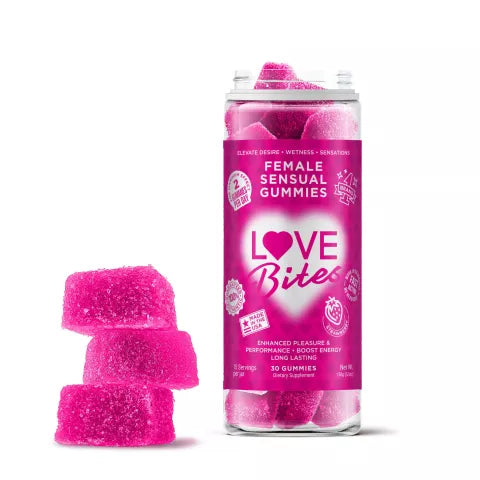 Try Love Bites Female Sensual Gummies in Strawberry, the sweet, fruity, juicy gummy made just for you and your needs. In the bedroom, Love Bites Sensual Gummies make things slower; they nibble you all over and let you peak when you're ready. There's no other female sensual gummies like these.